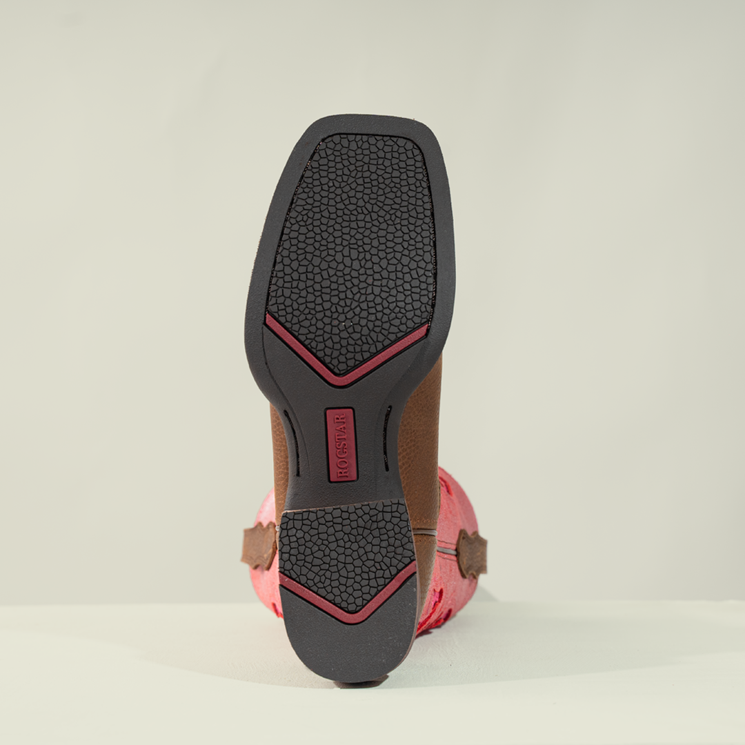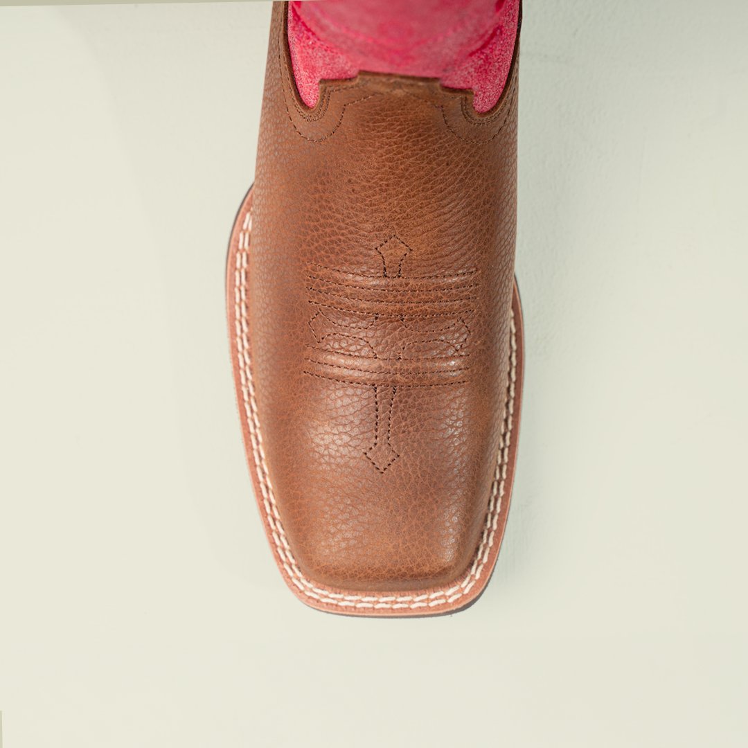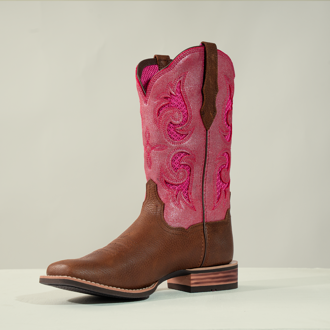 Bota vaquera para mujer con cuero auténtico y un diseño bordado en tonos rosados y femeninos.
